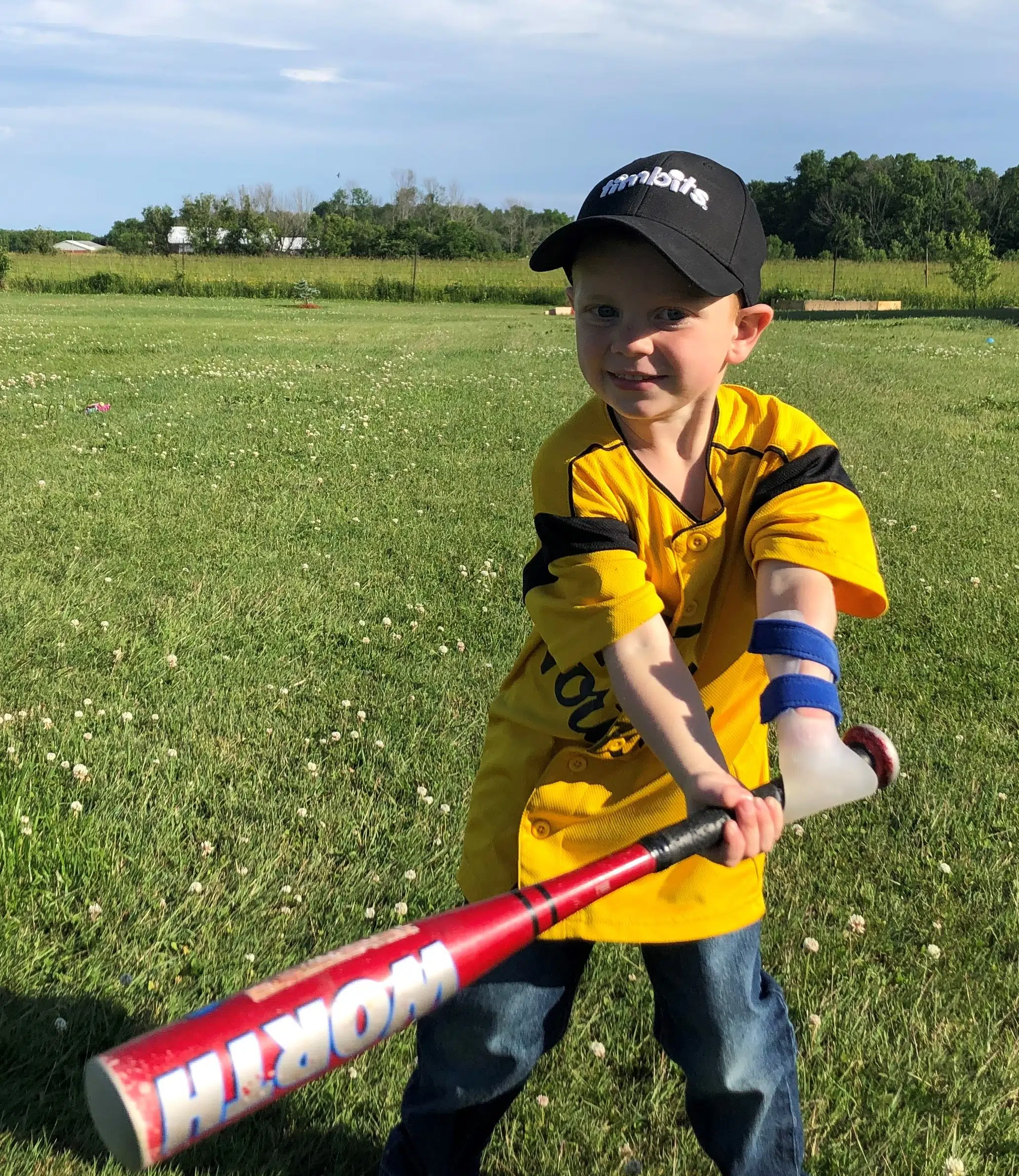 In a press release from War Amps, Casey’s mom, Susan, explained that he has been fitted for a device that allows him to grip a baseball bat and swing much harder than without it.