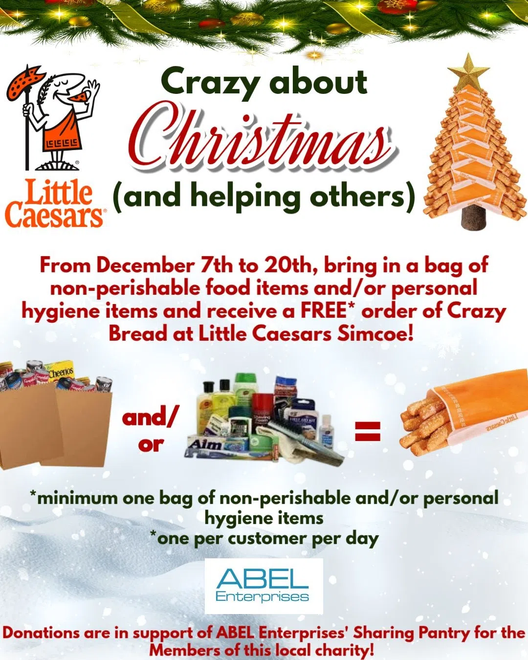 From now until December 20th, customers can bring non-perishable food items or personal hygiene products to Little Caesars Simcoe and receive a free order of Crazy Bread in return, with a minimum of one donated bag per exchange and a limit of one free order per person per day.