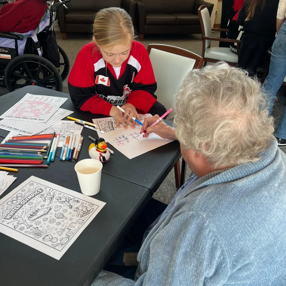 The young athletes spent time in the social room teaching a group of ladies how to make loom bracelets. They also created friendship bracelets for each senior in attendance. The team coloured pictures with residents while sharing refreshments and wrapped up the visit with a lively game of Olympic bingo.